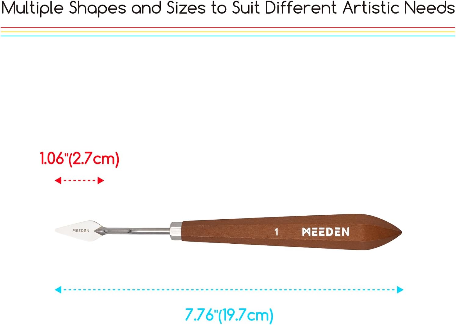 MEEDEN Artist Palette Painting Knife | Made from superior stainless steel for durability and corrosion resistance. Quick rebound to original shape after use. Curved neck design for easy paint pickup and improved handling. Premium beech wood handle for a smooth, comfortable grip. Enhances pressure and angle control for detailed work |
