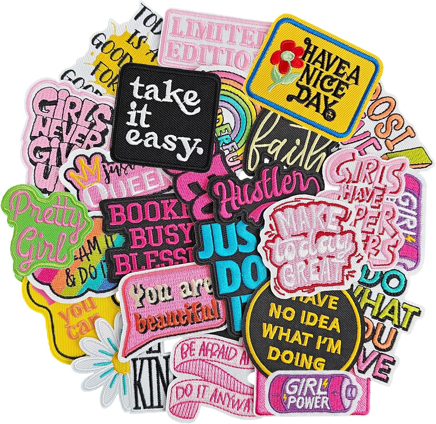 GYGYL 25Pcs Phrase Iron on Patches Includes 25 embroidered patches featuring uplifting and stylish positive phrases.